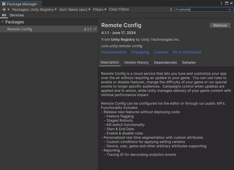 먼저 UGS와 연결된 Unity 프로젝트가 필요합니다. Unity Editor에서 Window > Package Manager로 이동해 Remote Config 패키지를 설치하세요.